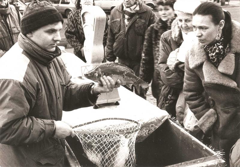 Przeglądając archiwum „Kuriera” można się natknąć na wiele ciekawych zdjęć będących świadectwem epoki i czasów w jakich powstawały. Nie są one znowu aż tak odległe. Na zdjęciu naszego redakcyjnego kolegi uwiecznione zostało uliczne stoisko z karpiami...