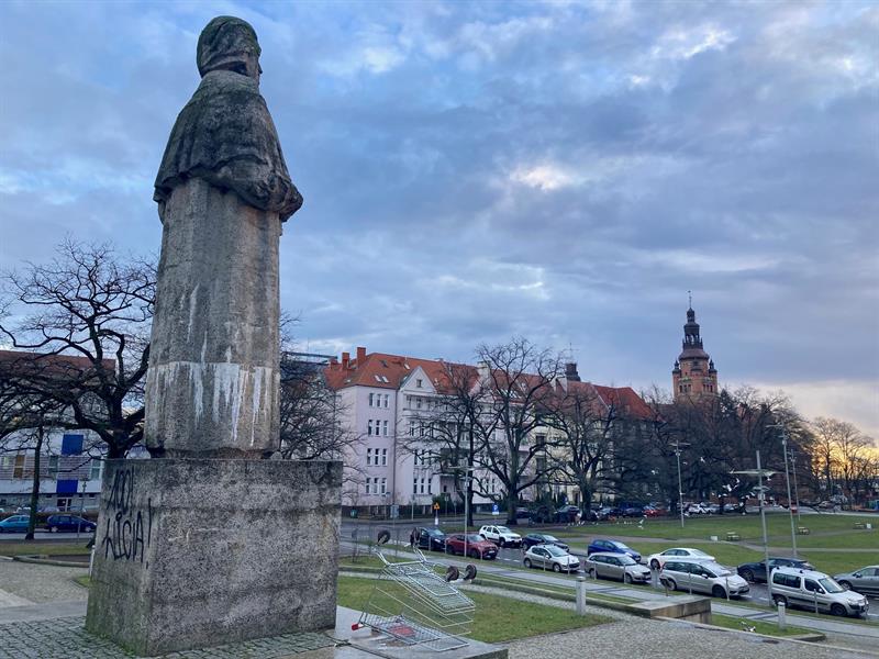 Tak prezentuje się pomnik Adama Mickiewicza w Szczecinie, tuż przy Wałach Chrobrego. Latem napis na nim wymalowali wandale. W miniony piątek ktoś przy wieszczu „zaparkował” sklepowy wózek. O zniszczonym pomniku pisaliśmy w sierpniu ub. roku. Zapewniano...