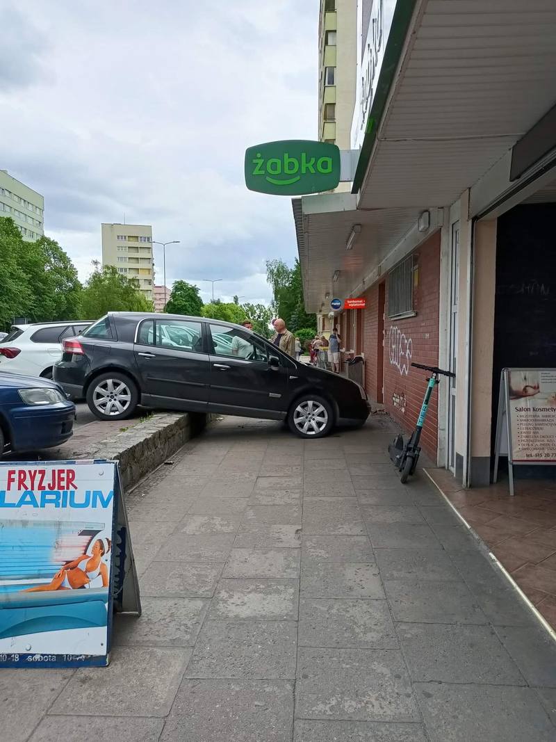 Niecodzienny widok zastali dziś (13 czerwca) mieszkańcy ul. Santockiej w Szczecinie na jednym z parkingów przed sklepami. Czarny renault zjechał z miejsca postojowego i uderzył w ścianę budynku. Nie wiadomo, czy kierowca zapomniał zaciągnąć ręczny hamulec...