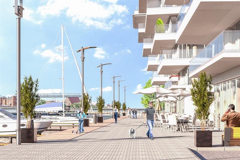 Na ponad 12 tys. metrów kwadratowych - między ul. Heyki, Składową i bulwarem Elbląskim - powstanie około pół tysiąca mieszkań. W pierwszym etapie, objętym pozwoleniem na budowę, staną budynki usytuowane najbliżej wody. Znajdzie się w nich 246 mieszkań o powierzchni od 30 do 97 metrów kwadratowych. Dla każdego z lokali zaprojektowano miejsce garażowe w kondygnacji podziemnej lub na parterze. Jak zapewnia inwestor, „kaskadowa zabudowa, duże przeszklenia oraz tarasy przypominające pokłady dalekomorskiego wycieczkowca pozwolą mieszkańcom delektować się widokiem na rzekę i panoramę Szczecina". Na parterach