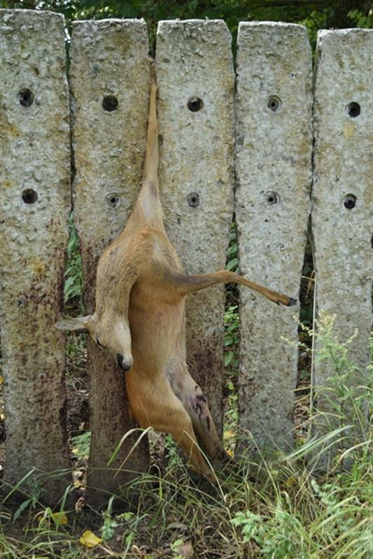 Ekolodzy twierdzą, że na ciągnącym się przez 19 km płocie wykonanym z betonowych podkładów kolejowych wokół kopalni surowców mineralnych i gospodarstwa rolnego w Golinie giną dzikie zwierzęta. Bulwersujące zdjęcia, na których widać martwe, zaczepione na szczerbach w ogrodzeniu i zwisające głowami w dół zwierzęta, trafiły do sieci, budząc oburzenie internautów. Tymczasem właściciel gospodarstwa twierdzi, że padł ofiarą prowokacji. Jego zdaniem zwierzęta nie tyle giną na ogrodzeniu, co raczej są tam wieszane. Po przebadaniu jednego z martwych koziołków okazało się - jak twierdzi - że zwierzę to wcześniej zginęło pod kołami samochodu. Czy martwe zwierzęta próbują przeskakiwać ogrodzenie? - pyta właściciel. W odpowiedzi założycielka stowarzyszenia „W Zielone Gramy" pokazuje kolejne zdjęcia, na których widać zakleszczoną między podkładami sarnę, którą udało się uratować.