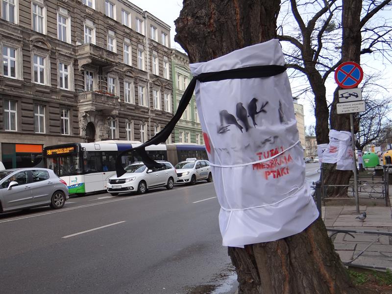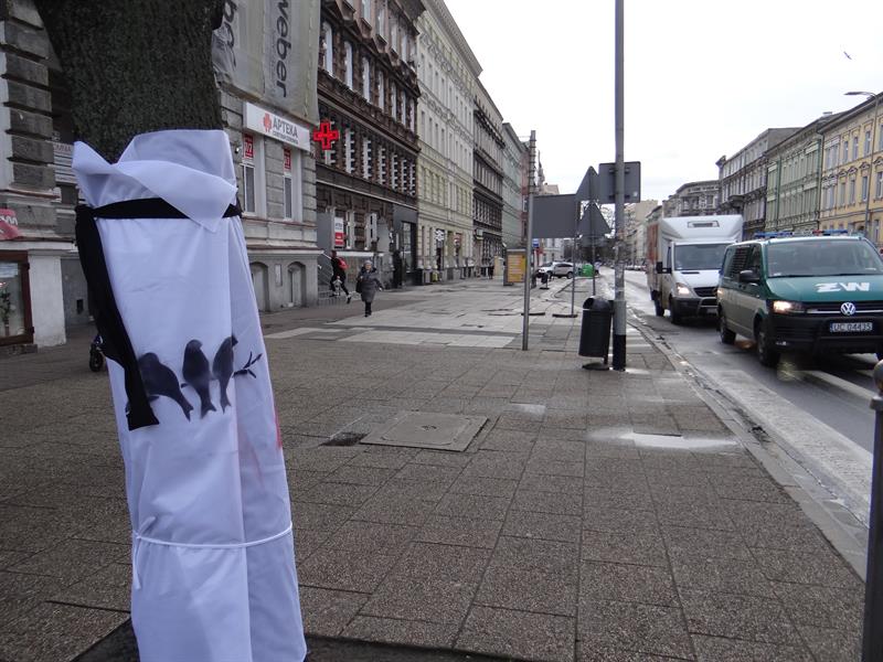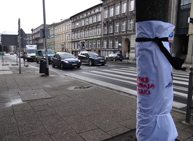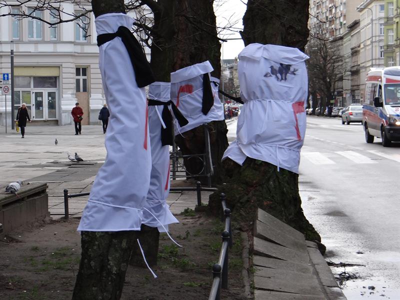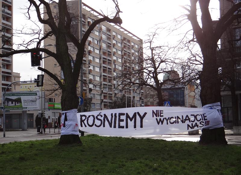 Pnie starych drzew przepasane kirem. Pomiędzy nimi rozwieszony transparent z poruszającym hasłem: „Rośniemy - nie wycinajcie nas!".