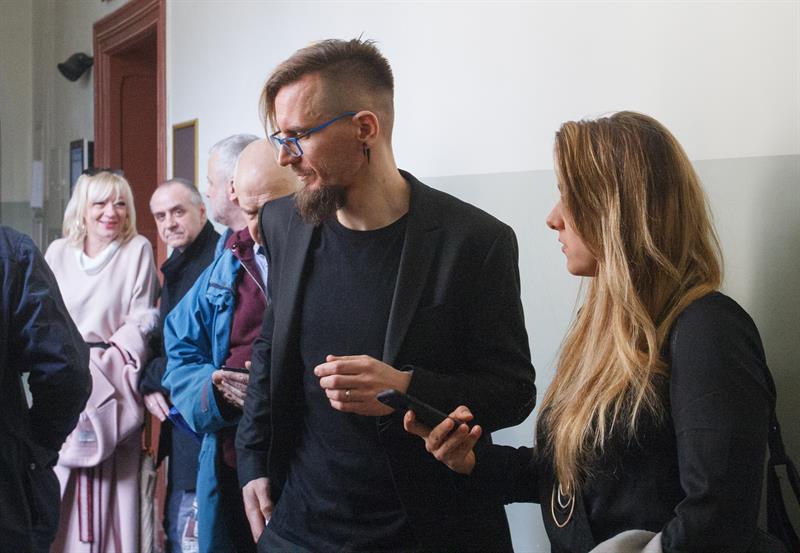 Paweł Jackowski przed wejściem na salę rozpraw. Ww sądzie, wspierali go przedstawiciele organizacji opozycyjnych.