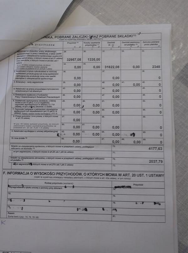 Z dokumentów przedstawionych nam przez nauczyciela kontraktowego w ZSS wynika, że w rozliczeniu rocznym brutto ze wszystkich źródeł dochodu, z wszystkimi dodatkami – trzynastką, premią itp. uzyskał on 31 622 zł, co podzielone przez 12 miesięcy w roku daje 2635 zł miesięcznie, przed odliczeniem podatku, składki zdrowotnych i społecznych. Nauczyciel stażysta uzyskał ze wszystkich źródeł dochodu ze wszystkimi dodatkami 35 693 zł przez rok. To daje mu 2974 zł miesięcznie minus składki zdrowotne i społeczne. Z wykazó