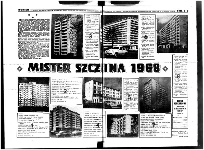 „Kształt architektoniczny nowych budynków jest różny. Jedne podobają się bardziej, inne mniej. Ale przecież z każdym rokiem rosną nasze wymagania i stajemy się coraz bardziej wybredni. Chcemy bowiem, aby nasze miasto było piękniejsze, nasze budownictwo wygodne i nowoczesne. Świadczą o tym opinie Czytelników w dorocznym plebiscycie «Kuriera Szczecińskiego na Mister Szczecina» - czytamy w wydaniu z kwietnia 1969 roku.