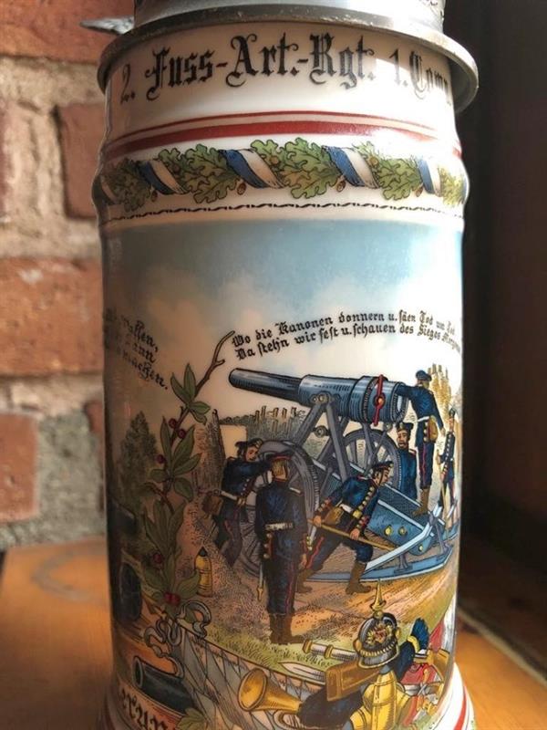 Kufel jest pamiątką po odbytej służbie wojskowej. Należał do rezerwisty z 2. Pułku Artylerii Pieszej. Na naczyniu w staranny sposób uwieczniono wizerunki najważniejszych broni używanych w pułkach artylerii pieszej, fortecznej.
