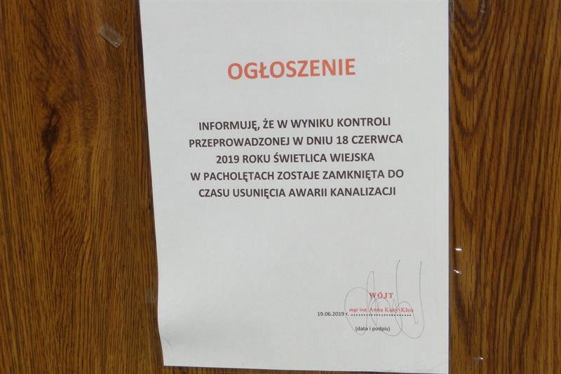 Awaria zgłoszona została w maju br. Im bliżej było czerwcowego odpustu, tym bardziej lokalni liderzy niepokoili się o przebieg imprezy, świetlica bowiem była nieodzowna dla sprawnego przebiegu zaplanowanych działań. Placówka wyposażona jest w kuchnię oraz ogólnie dostępną toaletę, co w przypadku dużej imprezy jest bardzo ważne. Interweniował sołtys Stanisław Czyż i mieszkająca w Pacholętach radna Maria Markowicz. Niestety, 19 czerwca br. na drzwiach placówki wywieszono ogłoszenie podpisane przez wójt Annę Kusy-Kłos, że „w wyniku kontroli przeprowadzonej w dniu 18 czerwca