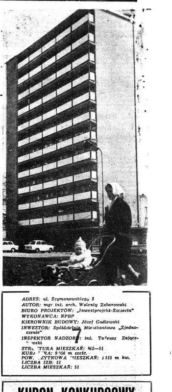W 1968 roku komisja konkursu już po raz siódmy zebrała się przy stole redakcyjnym, aby wybrać kandydatów do tytułu najlepszego budynku mieszkalnego w mieście. Po wnikliwej lustracji kilkunastu domów wybrała siedem. Wówczas w skład komisji wchodzili: dyrektor „Miastoprojektu", prezes Oddziału Szczecińskiego SARP architekt Bohdan Skłodowski; naczelny architekt miasta Mieczysław Janowski; naczelny inżynier SZB mgr inż. Krzysztof Dietrich; dyrektor Oddziału Szczecińskiego Spółdzielczości Mieszkaniowej Edward Habura; sekretarz Towarzystwa Przyjaciół Szczecina Piotr Jędraszewski; wiceprezes SARP Witold Jarzynka; redaktor naczelny „Kuriera Szczecińskiego" Zdzisław Czapliński.