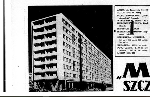 Za najlepszy budynek mieszkalny szczecinianie uznali dom oznaczony numerem 94-99 przy ulicy Roosevelta – obecnie al. Wyzwolenia 25-39. Koncepcję architektoniczną opracował Henryk Nardy. Wykonawcą było Szczecińskie Przedsiębiorstwo Budownictwa Miejskiego nr 1, a kierownikiem budowy Józef Zelach. Kubatura obiektu wynosi ponad 43 tys. metrów sześciennych. Wówczas mieszkania zajmowały ponad 8 tys. mkw., a usługi – 1043 mkw. W budynku znajdowały się dwie kawalerki, 45 mieszkań dwupokojowych, 160 trzypokojowych oraz 33 czteropokojowe.