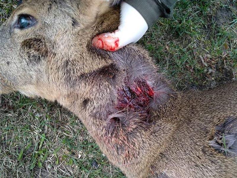 Na zdjęciu: Sarna pogryziona przez właścicielskie psy - z uszkodzonym odcinkiem szyjnym kręgosłupa oraz licznymi ranami zadu. „W takim wypadku jedyną pomocą jest już tylko eutanazja" - przyznaje Michał Kudawski.