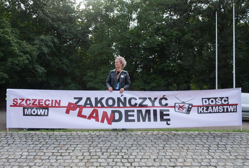 Wrzesień, pomnik Czynu Polaków. Manifestacja koronasceptyków. Zgromadziła ok. 200-300 osób. Jak na szczecińskie standardy - niemało. Zwłaszcza że manifestacja została zorganizowana oddolnie, przez portal Facebook. Na transparentach hasła takie jak „Politycy i media roznoszą wirusa paniki" czy „Szczecin mówi: Zakończyć plandemię". Część uczestników trzyma biało-czerwone flagi.