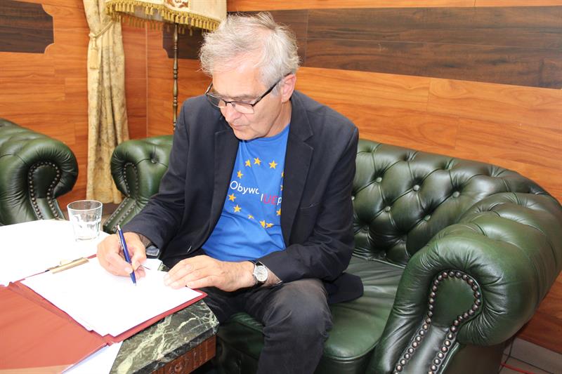 - Jestem w tej chwili bardzo sfokusowany na Unię Europejską, toteż oprócz marynarki włożyłem koszulkę z napisem „Jestem obywatelem Unii Europejskiej", by popularyzować jej ideę. Szukam miejsc, które pokazują, że Polska jest członkiem Unii Europejskiej. Gratuluję temu miastu oraz jego włodarzom, że na placu Wolności oprócz flagi Polski jest tu też flaga Unii Europejskiej. To dla mnie budujące. Z żalem stwierdzam, że w stolicy Polski sztandaru Unii Europejskiej wciąż nie ma, co jest dla mnie haniebne, nie potrafię tego zrozumieć.