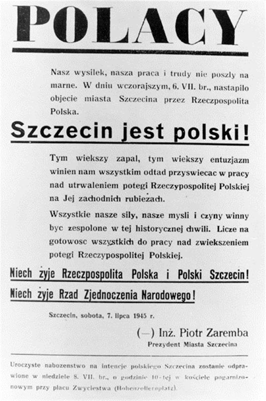 Pragnę przypomnieć, że między 26 kwietnia a 5 lipca 1945 r. dokonało się przejęcie Szczecina przez Polskę. (…) W 1945 r. miasto było wyludnione. 28 kwietnia rozpoczął urzędowanie tymczasowy polski prezydent Szczecina inż. Piotr Zaremba, mianowany na to stanowisko przez Rząd Tymczasowy. Trwała wojna. 30 kwietnia Piotr Zaremba z własnej inicjatywy wywiesił biało-czerwoną flagę na obecnym gmachu Urzędu Wojewódzkiego przy Wałach Chrobrego (okresie niemieckim Hakenterrasse), gdzie okresowo zainstalowano polską administrację miejską. Mimo że później dwukrotnie na polecenie władz centralnych (które działały