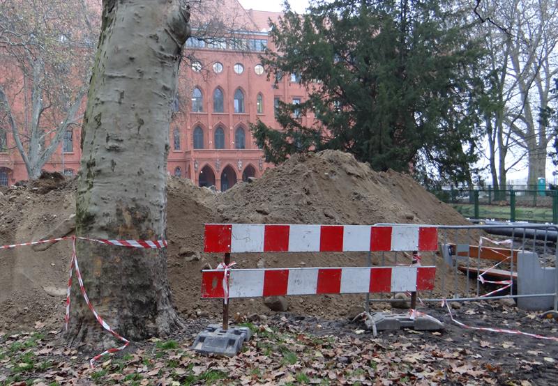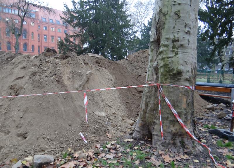 Mimo że prace są wykonywane przy użyciu ciężkiego sprzętu, pnie pomnikowych platanów nie zostały zabezpieczone w jakikolwiek sposób. Przeciwnie, niektóre posłużyły za stojaki podtrzymujące foliową taśmę pełniącą rolę głównego zabezpieczenia przed głębokimi wykopami. W takim stylu są prowadzone roboty na pl. Batorego w Szczecinie.