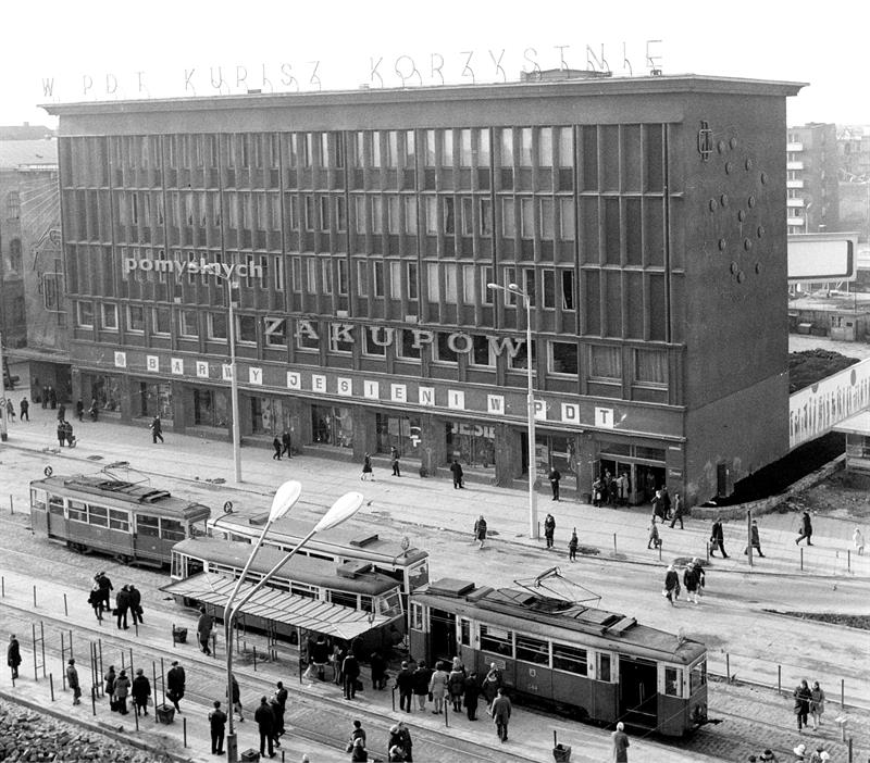 W domu towarowym - który tu oglądamy na archiwalnych zdjęciach Marka Czasnojcia z 1989 roku - można było kupić kurtki, płaszcze, garnitury, spodnie, koszule, swetry, bieliznę. Gdy na Zachodzie noszono dżinsy, w pedeciaku pojawiały się w latach siedemdziesiątych drelichowe spodnie, ale… nieścieralne.