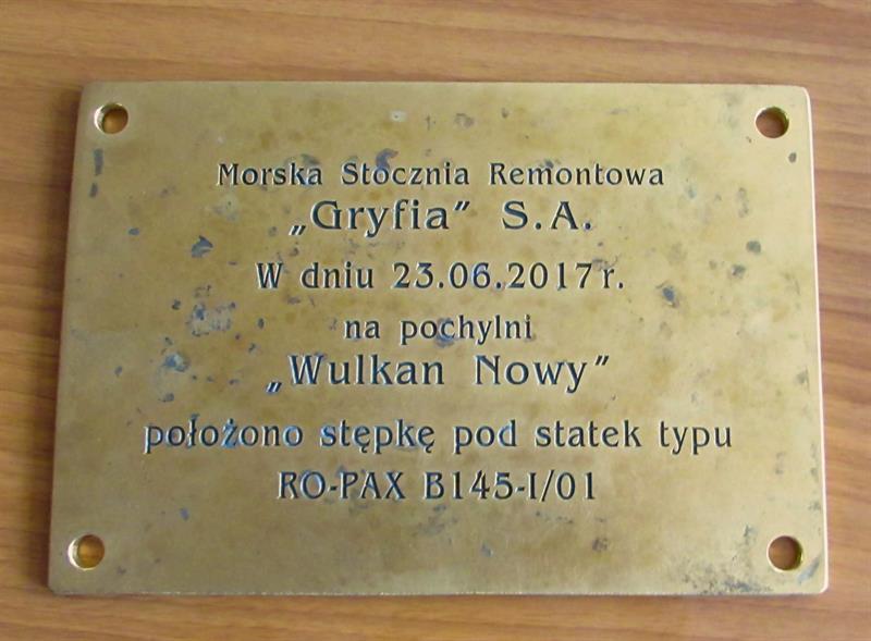 Przypomnijmy. Stępkę położono 23 czerwca 2017 roku na pochylni Wulkan w Stoczni Szczecińskiej i ta data jest formalnie uznana za rozpoczęcie budowy. Podczas uroczystości do kawałka metalu na stępce przybito tabliczkę z wygrawerowaną datą, numerem budowy oraz nazwą wykonawcy, czyli Morskiej Stoczni Remontowej „Gryfia". Tego rodzaju tabliczki spotyka się na ścianach eksploatowanych już statków. Są swoistą pamiątką.