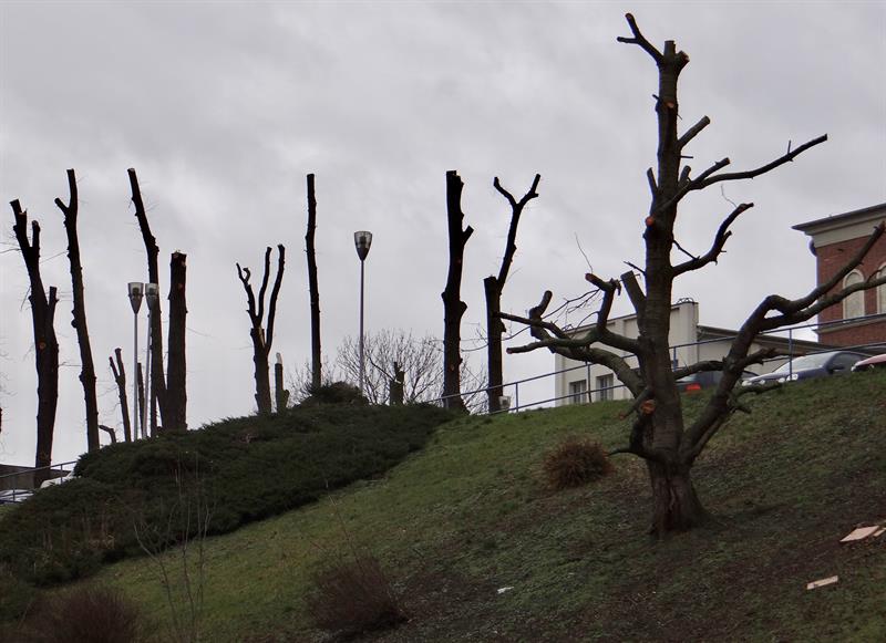 Na skarpie straszą kikuty ogłowionych drzew. Dziesiątki strzelistych pni przeznaczonych do wycinki. „Projekt modernizacji teatru przewidział uporządkowanie zieleni pod kątem kompozycyjnym oraz wycinkę tylko tej części, która bezpośrednio związana jest z miejscem inwestycji" - wyjaśnia Karolina Gradowska, kierownik ds. rozbudowy Teatru Polskiego w Szczecinie.