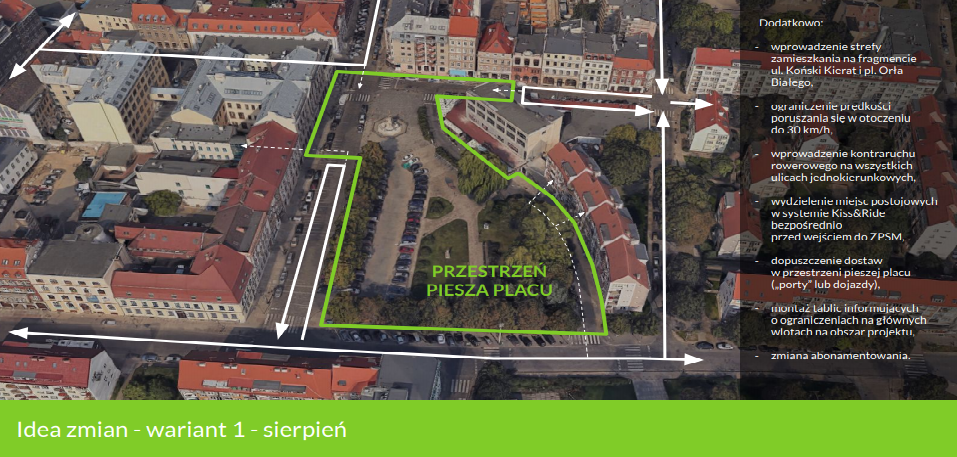 Pierwszy wariant prototypowy zakłada wyłączenie z możliwości przejazdu i parkowania części ul. Koński Kierat - od skrzyżowania z ul. Staromłyńską do wejścia do dawnej Łaźni Miejskiej, a także ulic okalających plac - z wyłączeniem ul. Grodzkiej oraz sąsiedztwa budynków Akademii Sztuki oraz banku. Dzięki temu pl. Orła Białego - wyłączony z ruchu aut i częściowo z możliwości parkowania - zostanie oddany w ręce szczecinian, otwarty na ich inicjatywy.