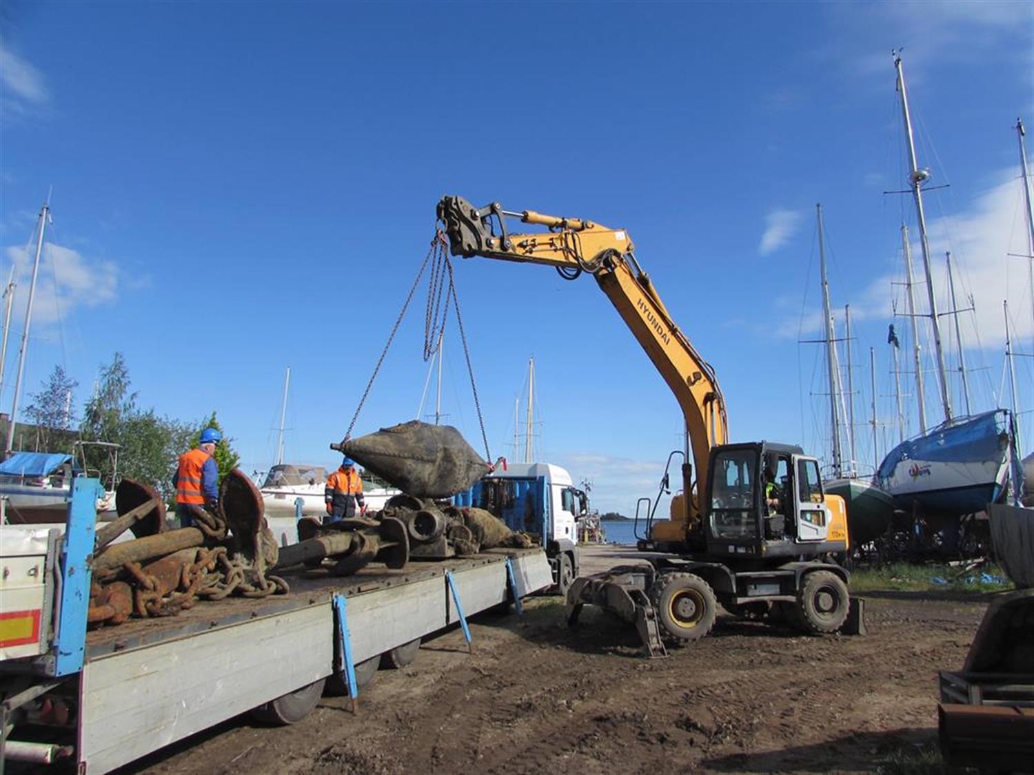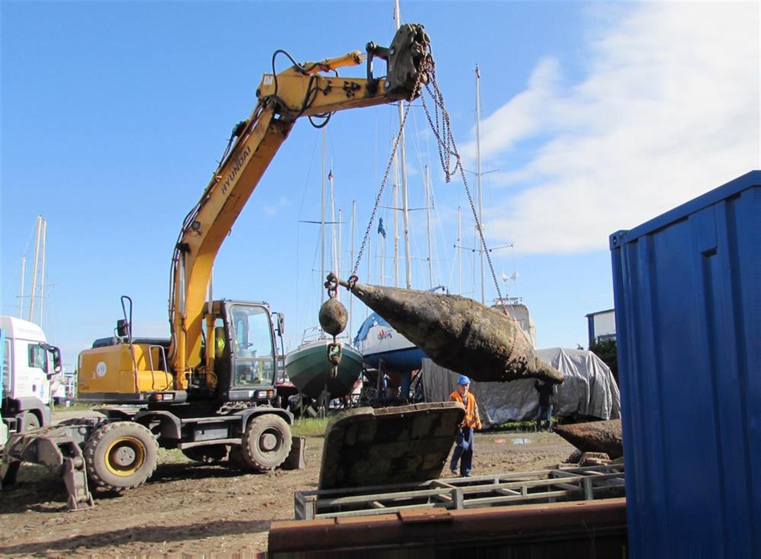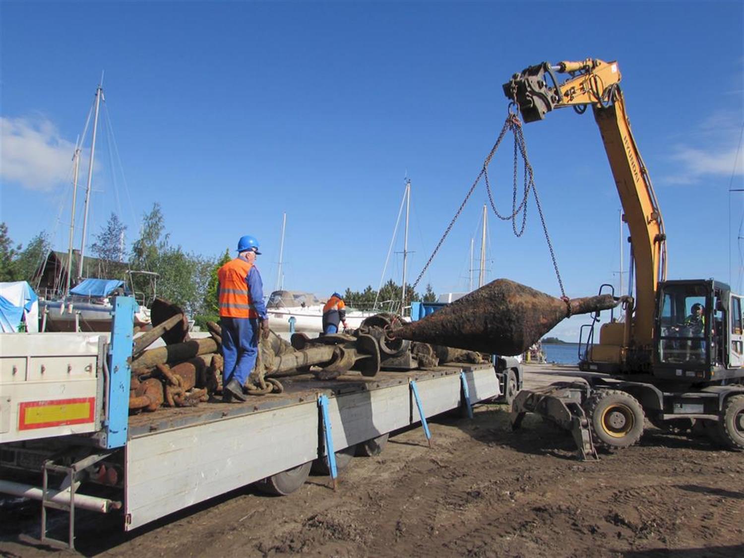 Współpraca Muzeum Oręża Polskiego w Kołobrzegu z Urzędem Morskim w Szczecinie przynosi kolejne interesujące efekty. We worek 12 maja na terenie siedziby firmy UW Service nad jeziorem Dąbie wyładowano kolejną grupę eksponatów wydobytych z wody podczas prowadzenia inwestycji „Modernizacja toru wodnego Świnoujście - Szczecin do głębokości 12,5 metra". Są wśród nich elementy wyposażenia jednostek pływających zarówno militarnych, jak i cywilnych, a także boje.