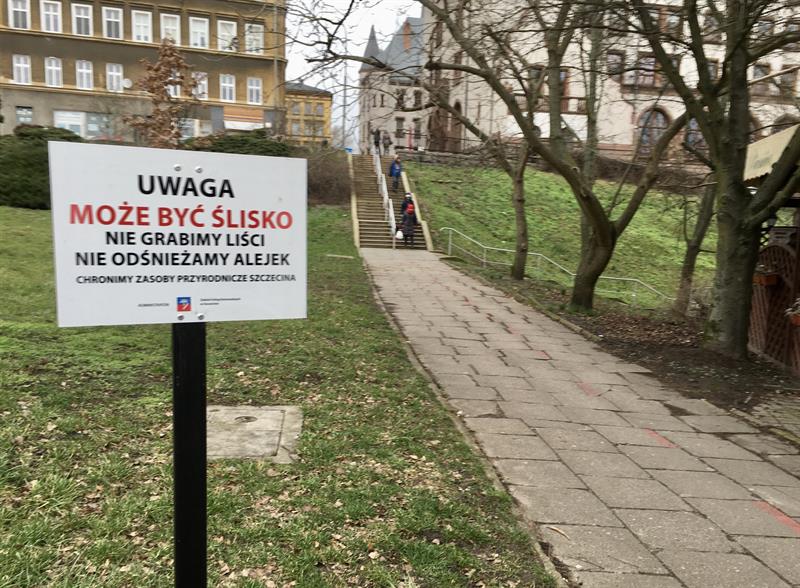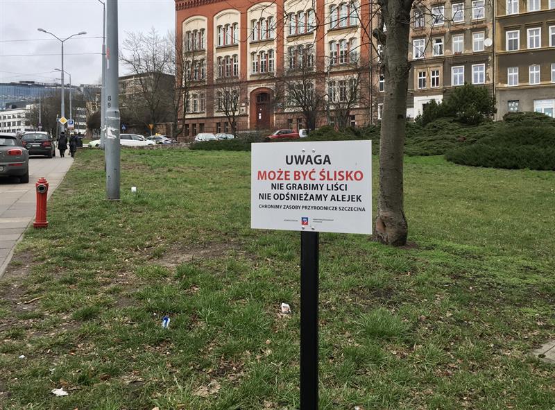 Jeszcze w listopadzie na szczecińskich terenach zielonych trwała zakrojona na szeroką skalę akcja uprzątania liści. Objęła także miejskie skwery i parki. Jakby nie miały znaczenia protesty społeczników, od co najmniej dwóch lat zabiegających o ochronę miejsc zimowania pożytecznych jeży. Przełom nastąpił w grudniu ub. roku, gdy Zakład Usług Komunalnych wydał 30 tysięcy złotych na przygotowanie i ustawienie 250 tabliczek z komunikatem: „Uwaga. Może być ślisko. Nie grabimy liści. Nie odśnieżamy alejek. Chronimy zasoby przyrodnicze Szczecina".