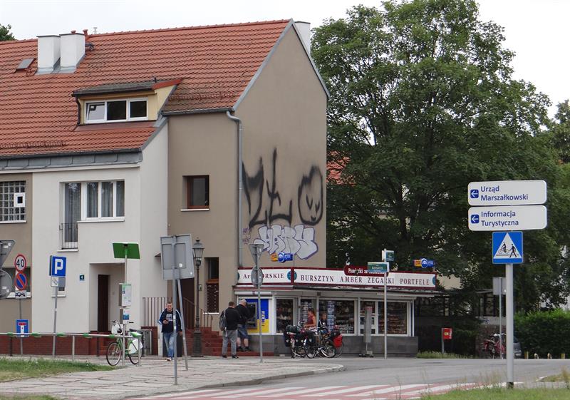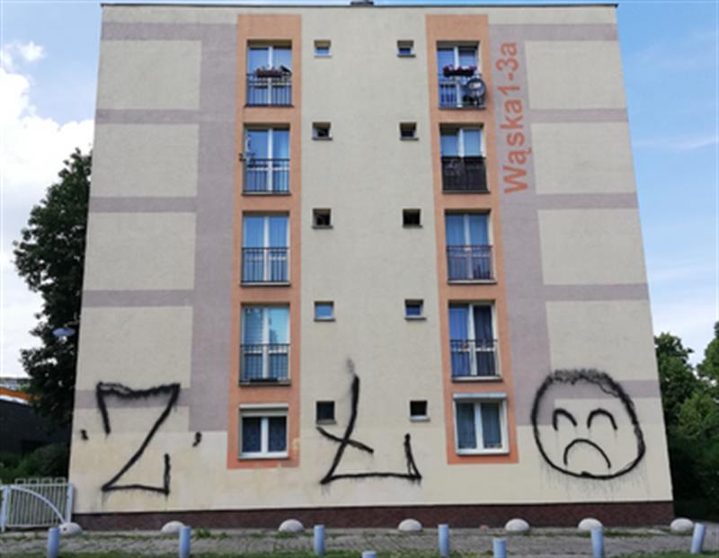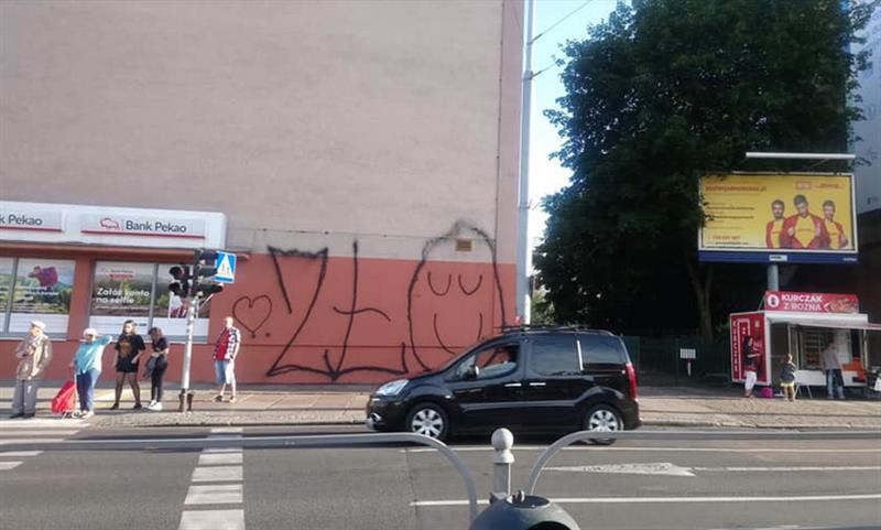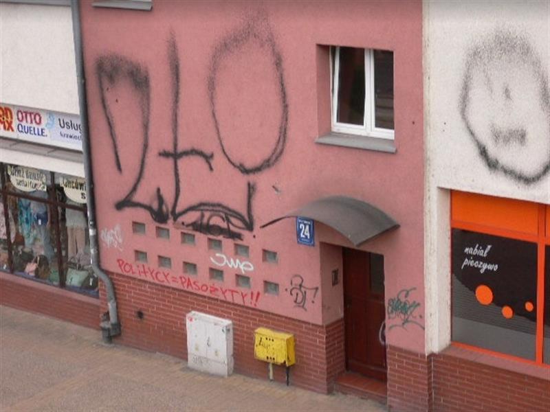 Takiego napisu nie maluje się w 2. sekundy ! Gdyby miasto było patrolowane to sprawca byłby złapany na gorącym uczynku. Tak samo jak i wielu innych : ciężarówki "mieszkające" od lat na chodniku naprzeciw prokuratury na Pogodnie, poniemieckie "szpachlówki" BMW ryczące urwanymi tłumikami przez wiele godzi na tych samych ulicach, pijaczkowie "prawdziwi właściciele miasta" wypłaszając mieszkańców i ich dzieci z wielu skwerów i ławeczek. To wszystko świadczy o jednym; Na naszych ulicach nie ma patroli i nie jesteśmy należycie chronieni.