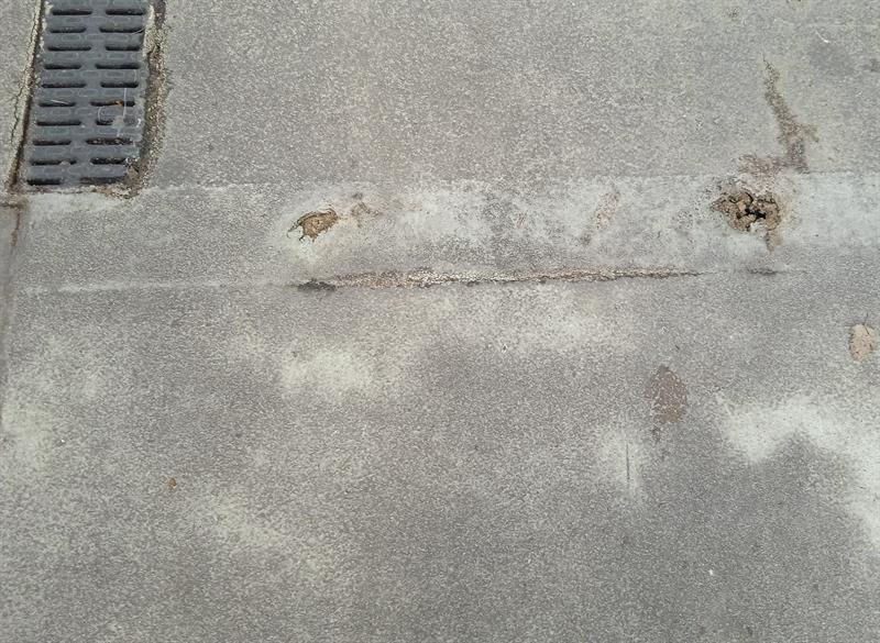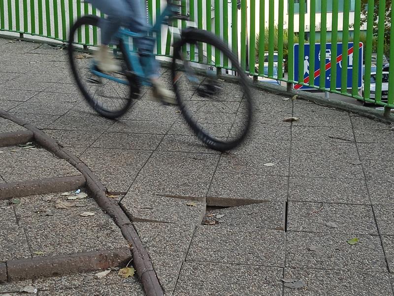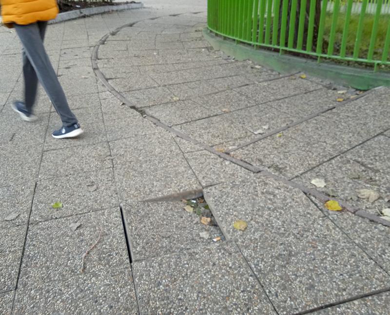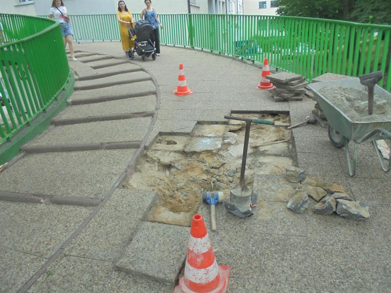 Obecny stan nawierzchni kładki nad ul. Wyszyńskiego: przełomy, pęknięcia, zapadliska. Zagraża bezpieczeństwu pieszych, rowerzystów oraz „hulajkarzy”. Fot. Arleta NALEWAJKO