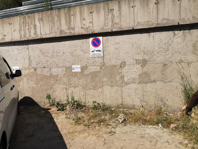 Za tym murkiem są zalane podziemne piwnice na głębokość do widocznego znaku zakazu. Piwnice są znacznie poniżej poziomu parkingu.