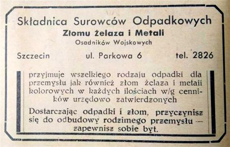 Dziś sporo się mówi i pisze o potrzebie recyclingu. Jednak nie jest to nic nowego. W czasach PRL również przywiązywano do tego wielką wagę. Już w pierwszych latach powojennych w szczecińskich gazetach można było znaleźć ogłoszenia informujące, że dostarczając odpadki i złom, przyczynisz się do odbudowy rodzimego przemysłu - zapewnisz sobie byt. Ogłoszenie z hasłem tej treści można np. przeczytać w Tygodniku Miasta Morskiego „Szczecin" z roku 1947. W tygodniku najczęściej anonse zamieszczali rzemieślnicy i firmy związane ze Związkiem Osadników Wojskowych, którzy jako jedni z pierwszych organizowali życie gospodarcze w powojennym Szczecinie. Wojskowi osadnicy doskonale wyczuwali, że warto zająć się odpadami nadającymi się do ponownego przetworzenia.