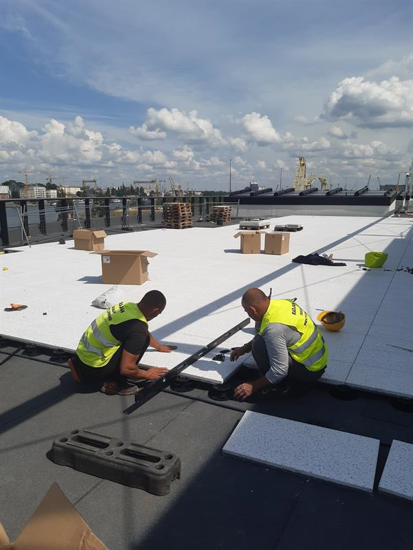 Obecnie na tarasie układane są białe płyty o wymiarach 80x40x4 cm. Taki kolor wynika ściśle z wymogów certyfikacji LEED. To normy określające czy budynek i materiały spełniają warunki przyjazne środowisku. Płyty tarasowe muszą mieć odpowiedni współczynnik odbicia promieni słonecznych i ciepła.