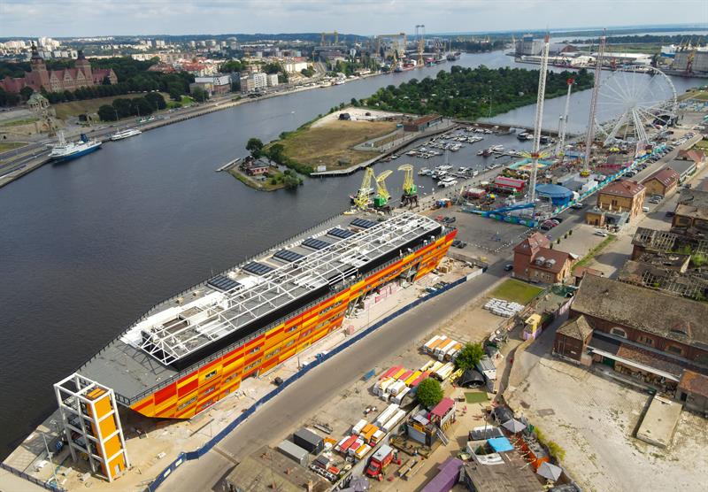 Wkrótce ma się rozpocząć montaż zewnętrznej powłoki elewacji Morskiego Centrum Nauki, czyli siatki ciętociągnionej. Dodajmy, że już niedługo z tarasu obiektu na Łasztowni będzie można podziwiać Odrę, Zamek Książąt Pomorskich czy Wały Chrobrego.
