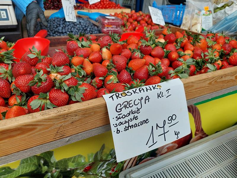Pod koniec maja 2022 roku za truskawki trzeba było wysupłać z portfela nawet 25 złotych. W tym roku owoce ze słonecznej Grecji kosztują 17,99 złotych, za polskie truskawki trzeba zapłacić o złotówkę drożej - to ceny, jakie widniały we wszystkich kramach na rynku w miniony poniedziałek. Czasy, kiedy na targowisko jechało się po tańsze owoce jednak bezpowrotnie minęły, nie ma także żadnej konkurencji na straganach - wszystkie, bez wyjątku, oferują tę samą cenę. Tymczasem w centrum miasta „rumbę" - to najczęściej spotykana o tej porze roku odmiana truskawek - można kupić nawet po 16,99 a nawet 14,99 złotych! Warto wspomnieć, że „rumba" to królowa odmian