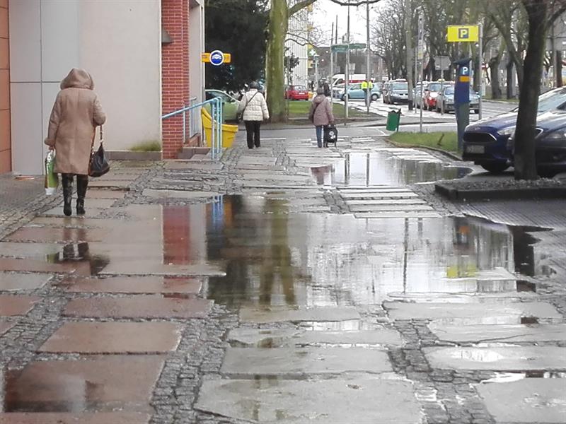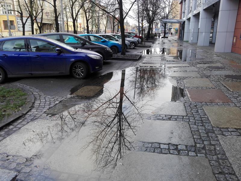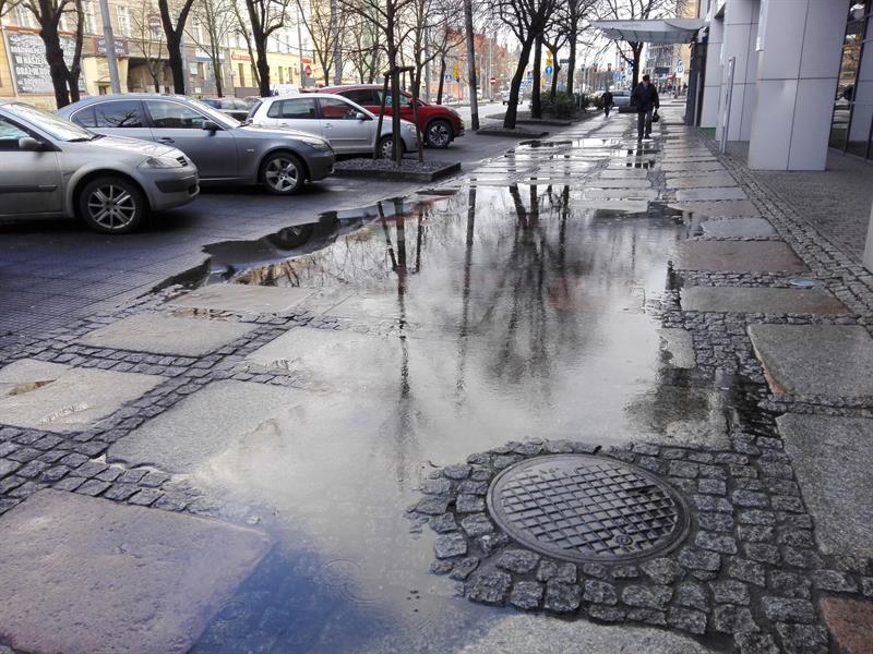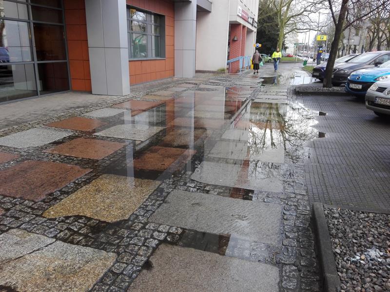 Odcinek chodnika ul. 3 Maja, przy Novotelu, tonie. Rozlewiska pojawiają się nawet po niewielkim deszczu i utrzymują tak długo, aż wyschną. „Odpowiednim działaniem byłaby budowa kanalizacji deszczowej" - przyznaje Michał Przepiera, zastępca prezydenta Szczecina. Prosta sprawa, więc… Dlaczego od ponad dwóch dekad szczeciński magistrat ani jednostki mu podległe nie zrealizowały tego przedsięwzięcia?