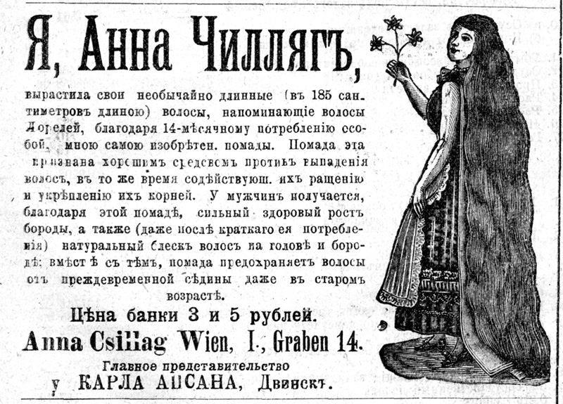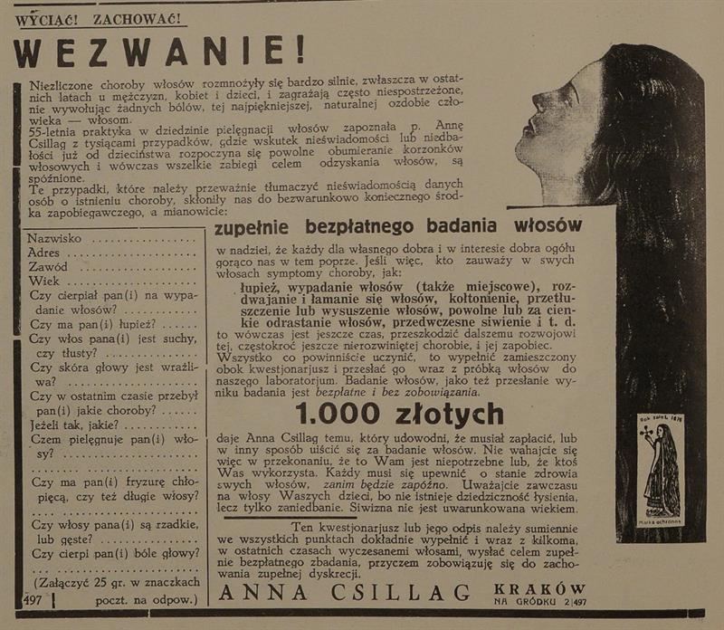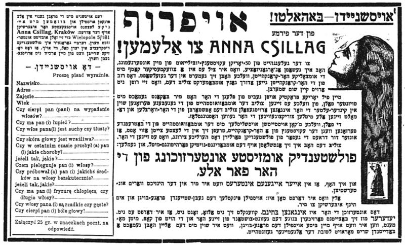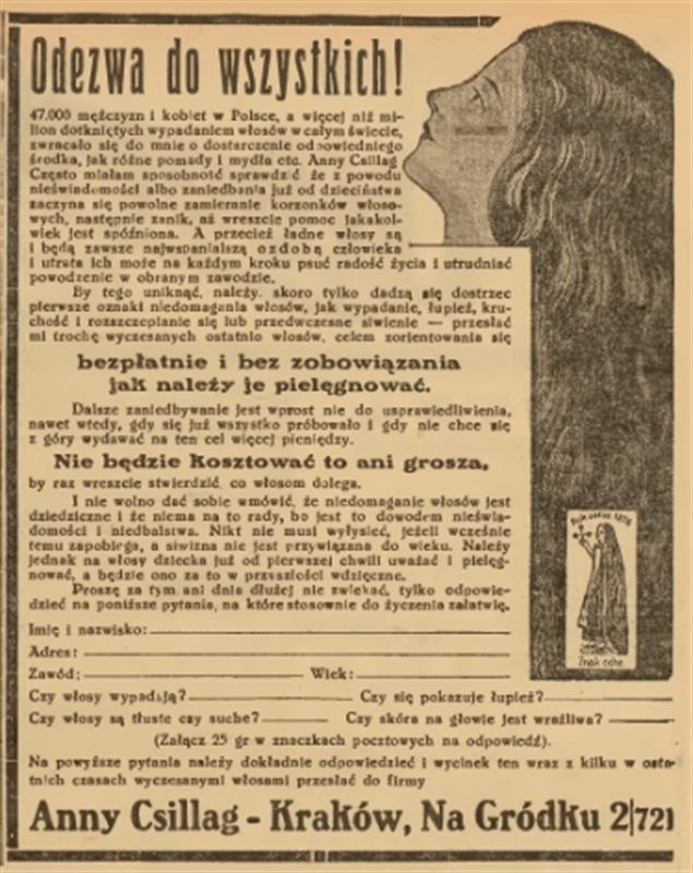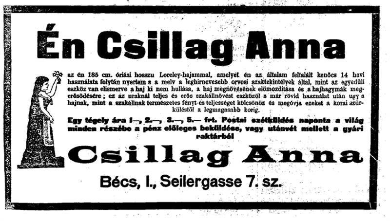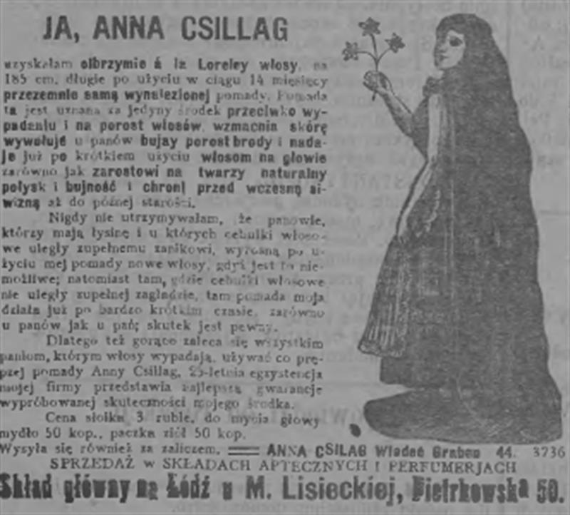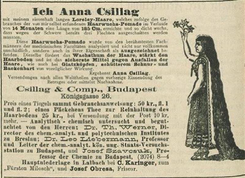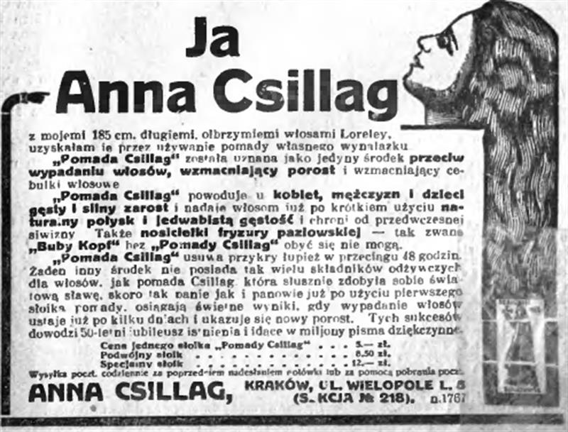 Przeglądając stare roczniki gazet, w tym „General-Anzeiger für Stettin und die Provinz Pommern", natknąłem się na reklamę cudownego środka na porost włosów, tudzież na ich barwienie. Twarzą tej bujdy na resorach była właśnie Anna Csilag, która wg jednych nigdy nie istniała, a według innych istniała. Istniała, czy też nie, to zapisała się w historii na długie lata.