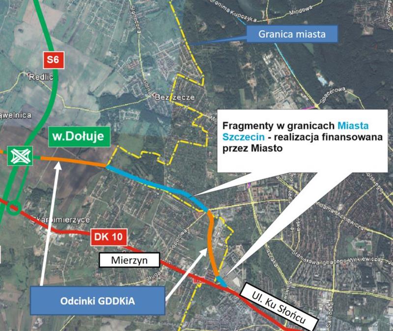 Nowy odcinek drogi krajowej nr 10, czyli obwodnica Mierzyna o długości blisko 8 km, rozpoczynać się będzie na wysokości Centrum Handlowego Ster i przebiegać ma m.in. do węzła Dołuje, łączącego się z planowanym Zachodnim Drogowym Obejściem Szczecina. Część nowej trasy na odcinku ok. 2,3 km, przebiegać ma przez tereny należące do Gminy Miasta Szczecin. Z tego względu miasto zamierza współfinansować opracowanie projektu oraz przyszłą realizację prac budowlanych, obejmującą fragment drogi w granicach administracyjnych Szczecina.