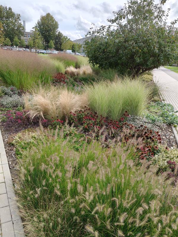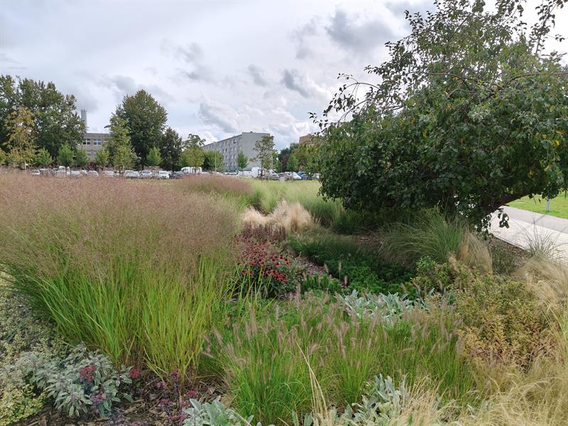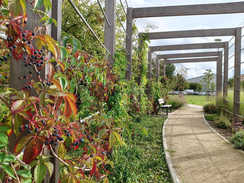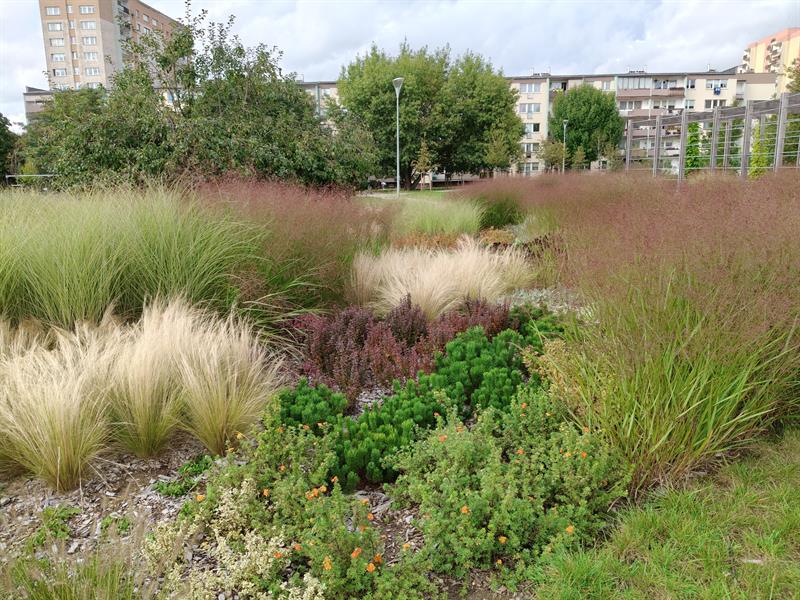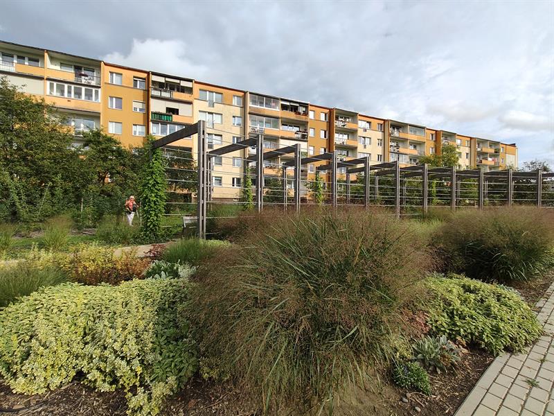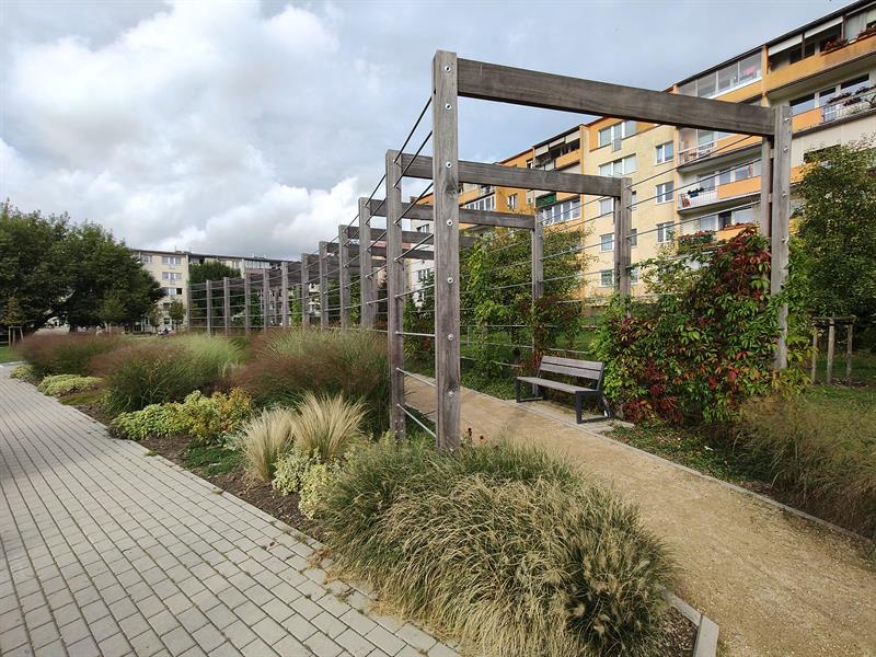 Sporą część 2,5-hektarowego terenu zajmuje istny kombinat rozrywki - wyjątkowo rozbudowany plac zabaw dla dzieci m.in. z huśtawkami, karuzelami, podniebną deskorolka i linarium. Jednak pozostała - to fantastyczne miejsce dla rekreacji i wypoczynku - bez ograniczeń wiekowych - z ławkami posadowionymi pośród oryginalnie zaaranżowanych rabat, na których teraz kwitną różnorodne trawy ozdobne, jeżówki i m.in. rozchodniki. Warto odwiedzić to miejsce, żeby np. docenić, jak do jabłoni starych odmian zostały dokomponowane drzewa ozdobne, jak zielony tunel z winobluszczu przebarwia się jesienią. I zdążyć zanim fioletowe budleje przestaną wabić motyle.