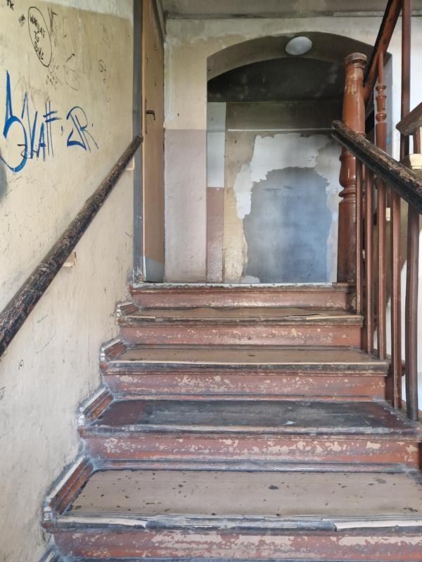 Ten budynek zdecydowanie odstaje od sąsiednich kamienic i oficyn. Jako jedyny w okolicy jest wyraźnie zaniedbany, na fasadzie same gołe cegły. W środku jest jeszcze gorzej: ze ścian klatki schodowej odpada złuszczona farba, czuć wilgoć, w okolicach piwnicy straszy dziura w ścianie. Do tego dochodzi jeszcze wandalizm w postaci wulgarnych napisów na ścianach i wspólne toalety na klatce. W mieszkaniach lokatorów wcale nie jest lepiej. Muszą walczyć z wilgocią i grzybem na ścianach. Brak łazienek