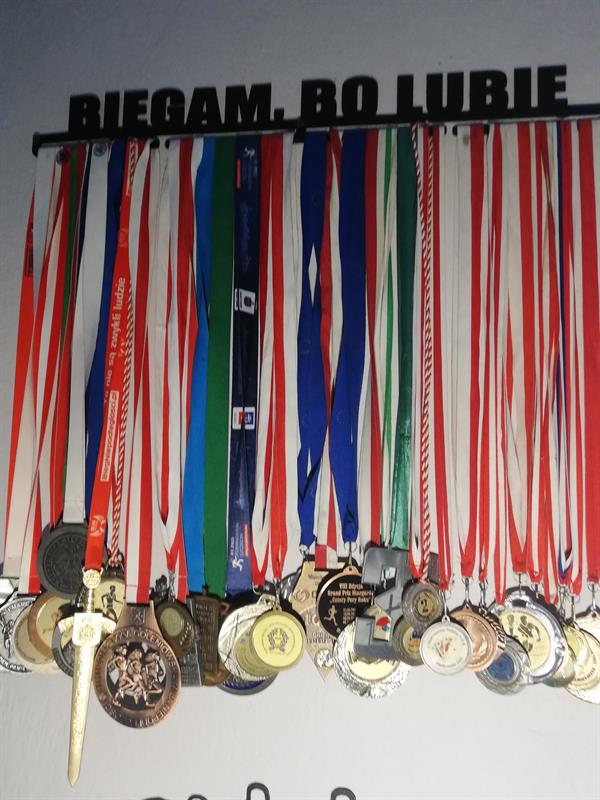 W swojej pokaźnej kolekcji, eksponowanej na dwóch wielkich wieszakach w szafie, pan Marcin ma 46 medali. W tym jeden jest szczególny, pozłacany w kształcie miecza. Zdobył go na największym biegu z okazji 100-lecia odzyskania przez Polskę niepodległości w Poznaniu. Brało w nim udział 2,5 tysiąca osób.