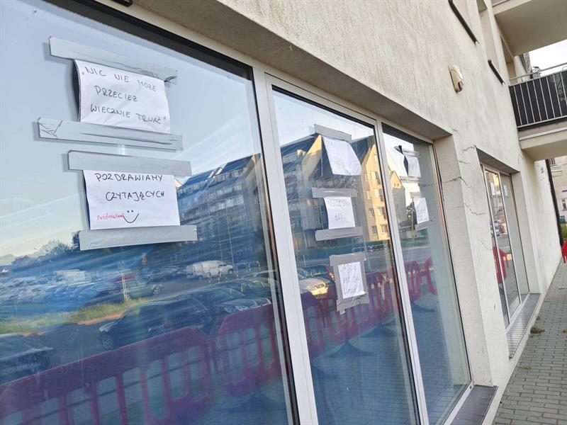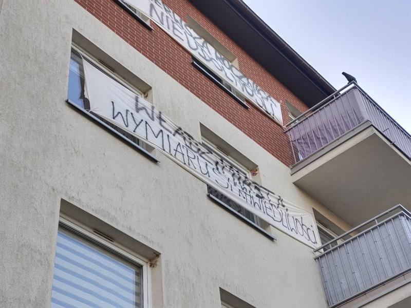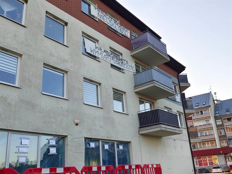 W rocznicę tragedii na spękanym budynku pojawiły się transparenty i kartki z hasłami wyrażającymi bezradność mieszkańców.