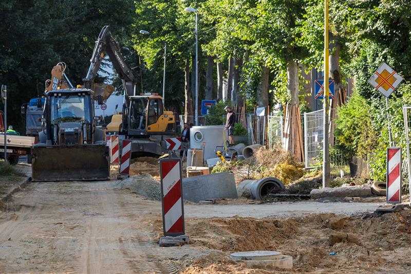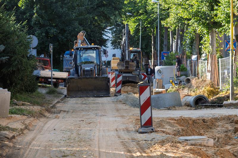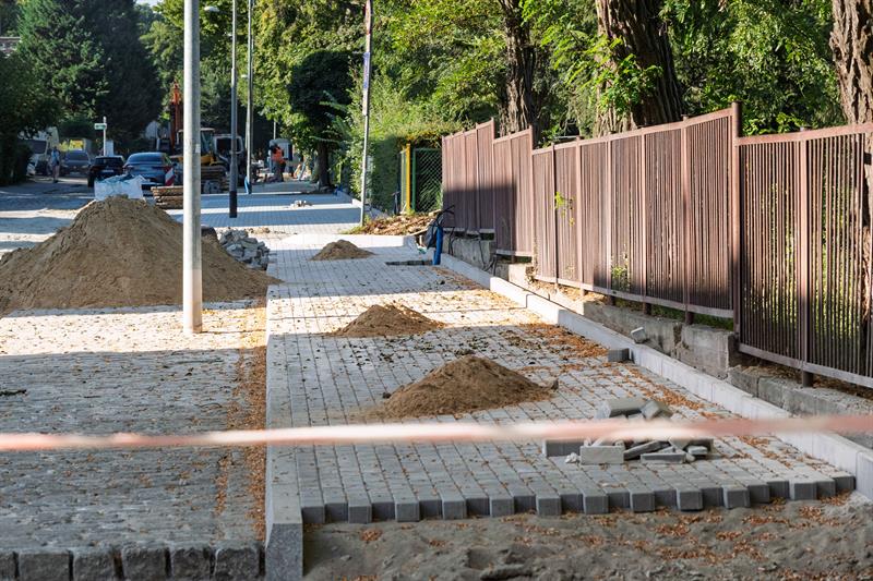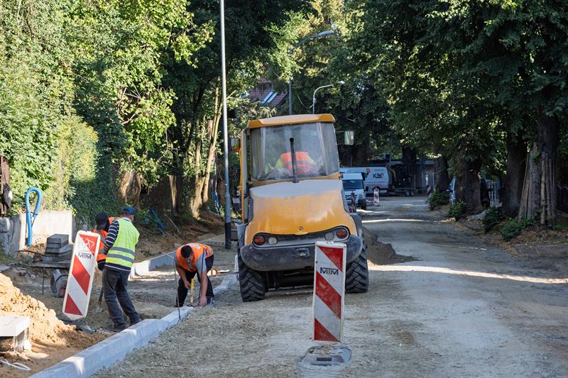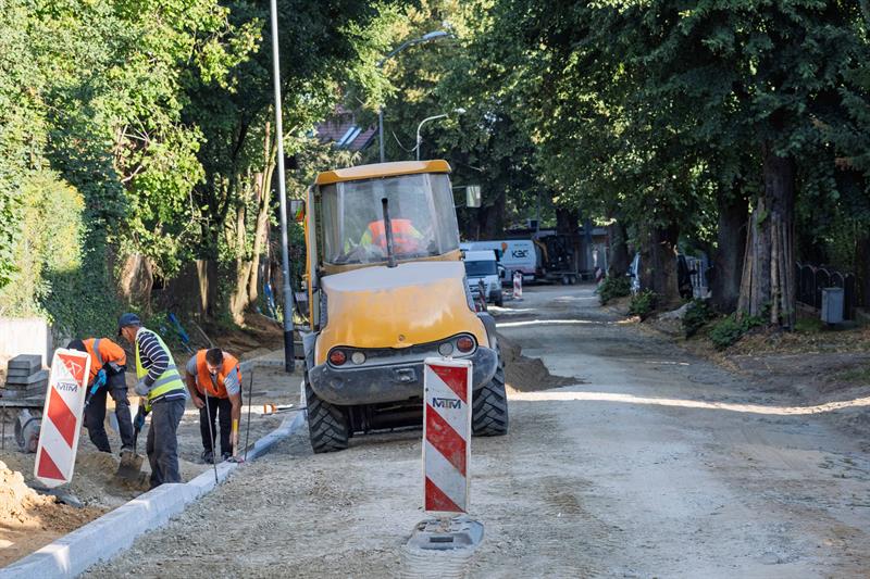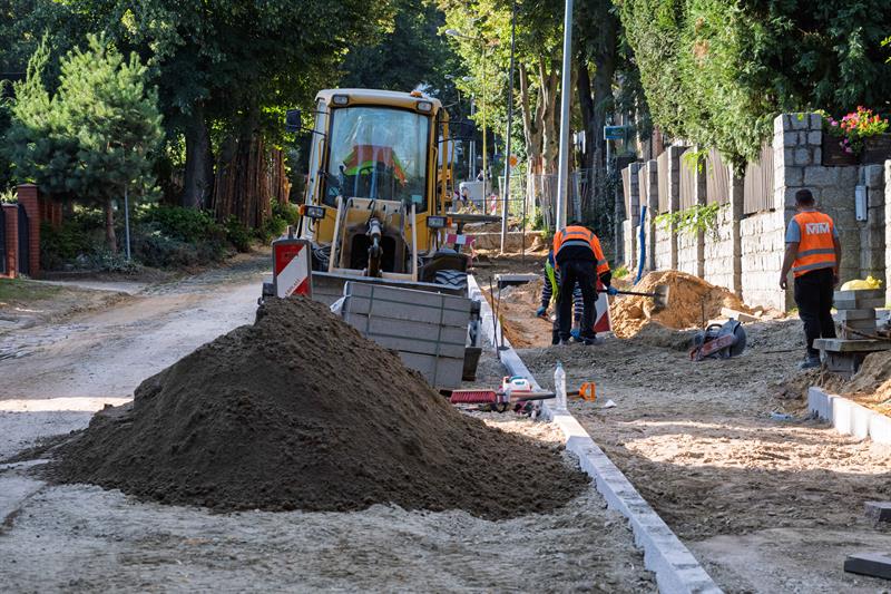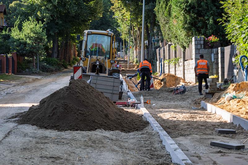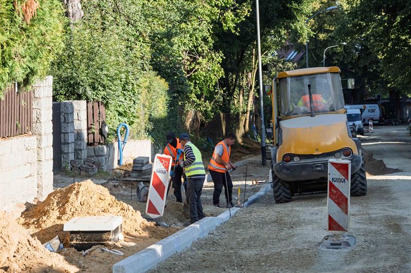 Na ul. Krzemiennej trwa obecnie formowanie przyszłej jezdni i chodników. W niektórych miejscach przygotowane zostały już podbudowy, na kolejnych odcinkach montowane są krawężniki i obrzeża, a wzdłuż ulicy powstają zatoki postojowe. Na ul. Smoczej prowadzone są natomiast roboty instalacyjne związane z budową kanalizacji deszczowej o dużych przekrojach. Równolegle zabezpieczane są istniejące sieci podziemne, tak aby w dalszych etapach możliwe było bezpieczne prowadzenie robót drogowych.