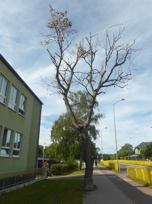 Trwa na pasie chodnika, a w bliskości ścieżki rowerowej. Mowa o potężnym drzewie, którego niemal całkowicie martwa korona sięga daleko wyżej niż dach sąsiedniej szkoły. „Ze względu na stwarzane zagrożenie powinno być niezwłocznie wycięte" - nie ma wątpliwości nasz ekspert.