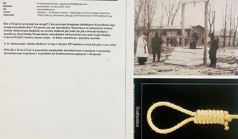 Treść maila Geblewicz upublicznił na portalu Facebook. Oto jego fragment „Kto ci frajerze przyznał ten urząd? I kto przyznał drugiemu złodziejowi Krzystkowi jego urząd prezydenta? Kto? Na pewno nie my mieszkańcy Szczecina, a to oznacza, że wybory zostały sfałszowane. Siedzicie na swoich stołkach już wiele lat jak sowiecki bandyta i morderca Józef Stalin. Wy…ać natychmiast od koryta, bo was stąd wyp.my. Całe to PO, KO i lewica razem wzięte - to hieny cmentarne i pasożyty narodu. A za odznaczenie Adama Bodnara wroga i zdrajcy RP będziesz wisiał jak pies a on z tobą". Wiadomości towarzyszyły dwa zdjęcia: egzekucji oraz szubienicy.