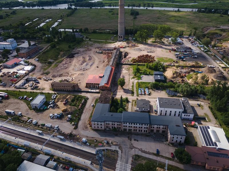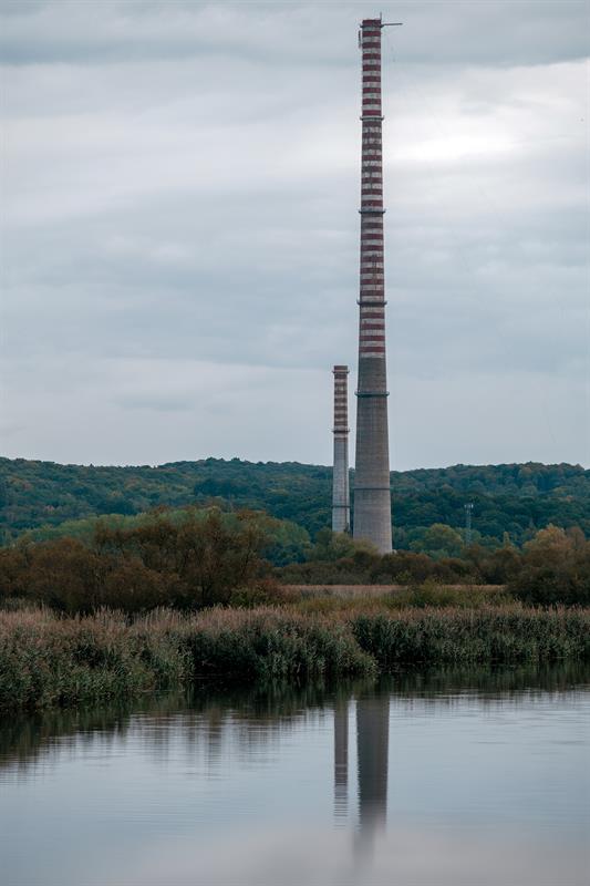 Nad nieistniejącymi zakładami góruje ogromy, wysoki na 252 metry komin. Niższy widoczny na zdjęciu 100-metrowy komin wyburzono w 2022 roku. Fot. Dariusz GORAJSKI