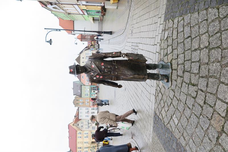 Wspomina wydarzenie z Darłowa, gdzie w 2016 roku odsłonięto rzeźbę pierwszego powojennego burmistrza tego miasta, Stanisława Dulewicza.