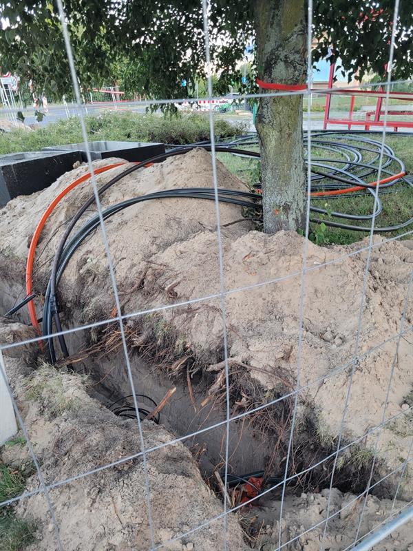 Wykop, w którym widać pourywane korzenie drzew: nieosłonięte, niezacienione, usychające w sięgającym ponad 30 stopni Celsjusza upale. Natomiast obok, już pod wciąż jeszcze zielonymi konarami, są składowane tony ziemi oraz materiały budowlane. „Tak w praktyce wyglądają standardy utrzymania szczecińskiej zieleni" - alarmuje Czytelnik.