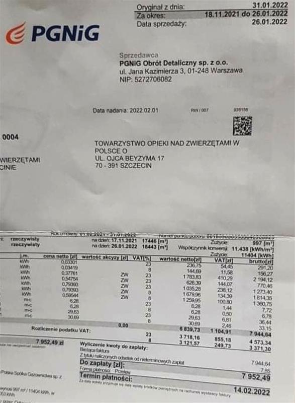 „Dziękuję za waszą pracę i poświęcenie. Oby dobro wróciło!" - napisała Agnieszka, odpowiadając na wezwanie: „Tak źle nie było nigdy... prosimy o pomoc" - szczecińskiego oddziału Towarzystwa Opieki nad Zwierzętami. Na pokrycie horrendalnego rachunku za gaz wpłaciła 20 zł. Dzięki ponad tysiącu innych równie wrażliwych na los naszych braci mniejszych darczyńców opłacenie kolejnych rachunków dla TOZ nie powinno być problemem.