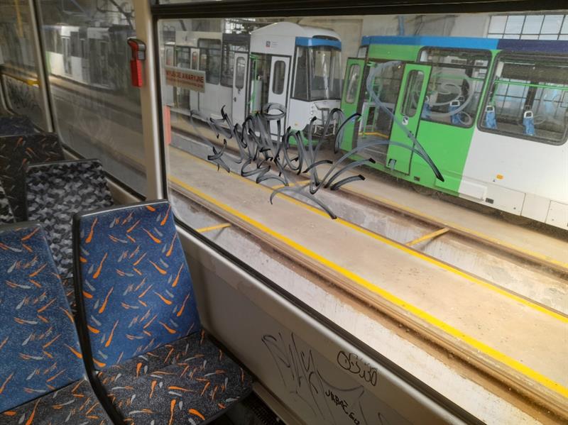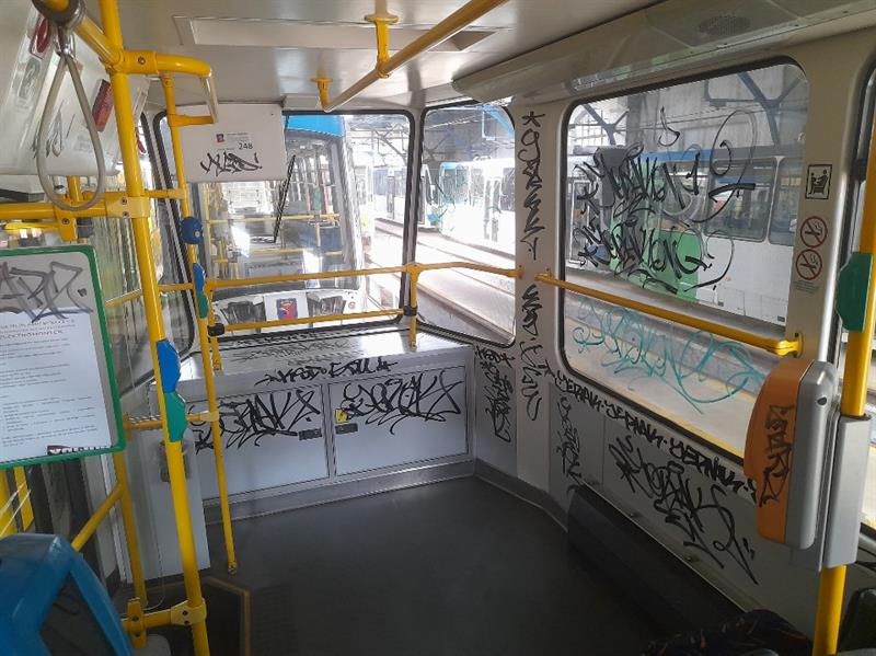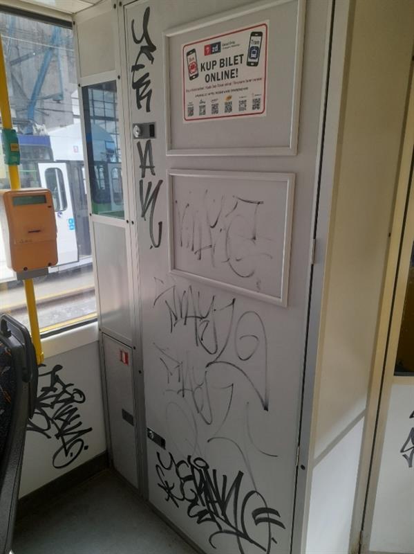 Tak wyglądają pojazdy komunikacji miejskiej po ataku chuliganów z pisakami w ręku. Nie wszystko da się umyć i wyczyścić, niektóre elementy trzeba wymieniać. To powoduje koszty i przestoje. Fot. Tramwaje Szczecińskie