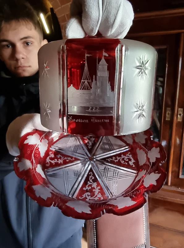 Osiem takich szklanic w różnej formie, tj.: pucharów, kałamarzy oraz tej najnowszej - kompletu do ciasta, wraz ze szklanymi podstawkami, również pięknie grawerowanymi, wzbogaca obecnie ekspozycję Muzeum Obrony Wybrzeża na prawobrzeżu Świnoujścia. Bo chociaż pasjonaci z Fortu Gerharda kolekcjonują przede wszystkim zabytki militarne, to jednym z najważniejszych zadań obiektu pozostają badania dotyczące historii miasta.