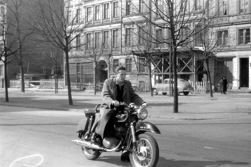 Na pierwszym planie widzimy kolejny pojazd. Tym razem jednoślad. Młody mężczyzna siedzi na motorze MZ ES 250. Był to jeden z pierwszych modeli z dwiema rurami wydechowymi, co wpływało niekorzystnie na dynamikę jazdy. Był to motor produkowany w bratniej, jak to się wówczas mówiło, Niemieckiej Republice Demokratycznej - NRD. Ich produkcję rozpoczęto w roku 1956 i od samego początku był przedmiotem pożądania młodych ludzi w krajach bloku socjalistycznego.