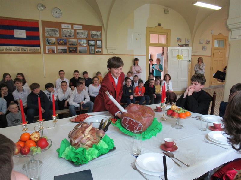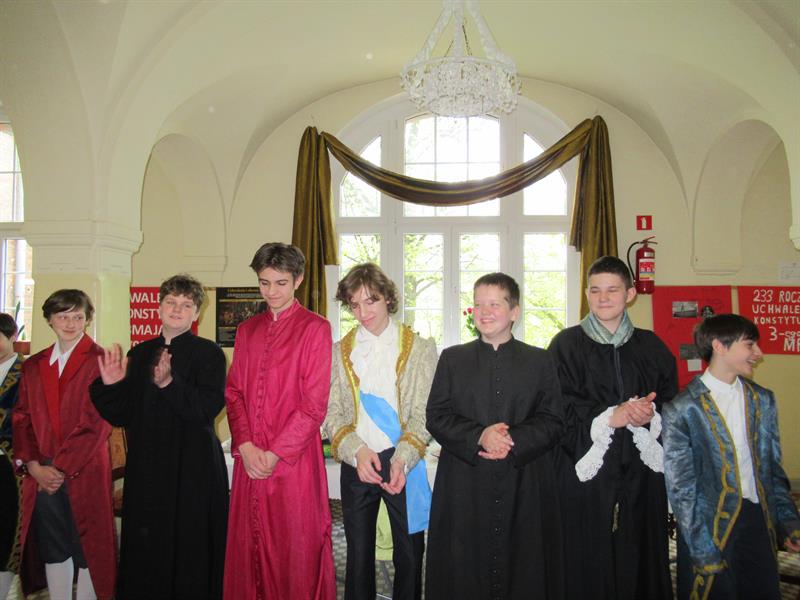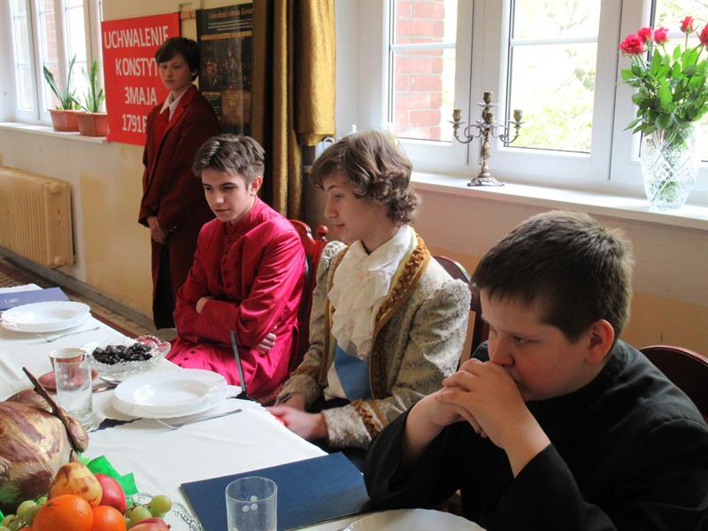- Postanowiłyśmy przybliżyć nieco klimat drugiej połowy XVIII wieku w Polsce za czasów panowania ostatniego króla Stanisława Augusta Poniatowskiego - wyjaśniają inicjatywę nauczycielki historii Elżbieta Jacorzyńska i Monika Surdyk, organizatorki rekonstrukcji. - Postać króla wiąże się wszakże z pracami i uchwaleniem pierwszej w Europie konstytucji. Stąd pomysł przedstawienia słynnego obiadu czwartkowego u króla Stasia. A że na obiadach bywali także późniejsi twórcy konstytucji, projekt wydawał się trafny i z rocznicą uchwalenia konstytucji powiązany.