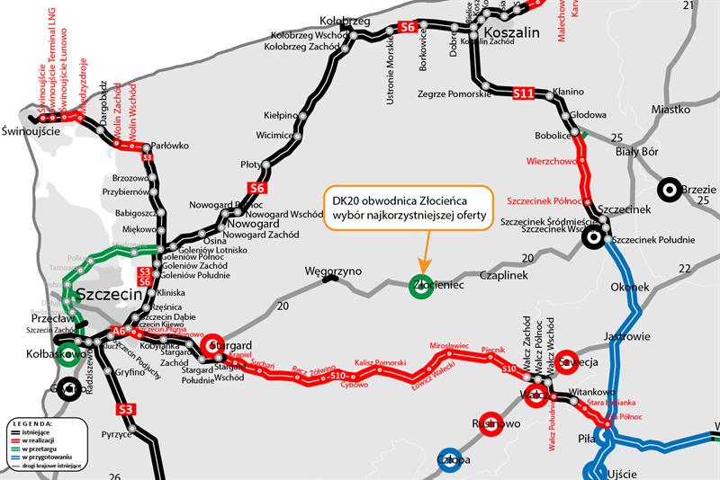 W przetargu na zaprojektowanie i budowę obwodnicy Złocieńca w ciągu DK20 zwyciężyła oferta firmy PORR o wartości 141,4 mln zł. Pozostali oferenci mają 10 dni na ewentualne odwołania do Krajowej Izby Odwoławczej. Przed podpisaniem umowy musi się jeszcze odbyć standardowa kontrola uprzednia Prezesa Urzędu Zamówień Publicznych.